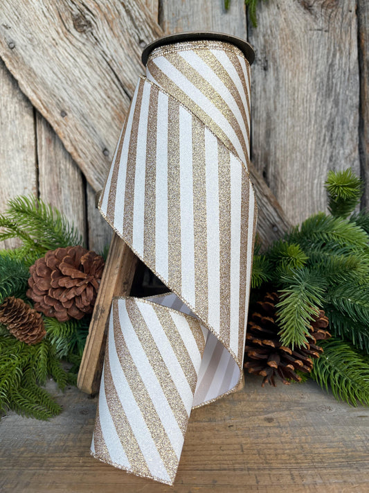 4" Gold Ribbon Stripe Ribbon, Gold White Christmas Ribbon, 10 Yards