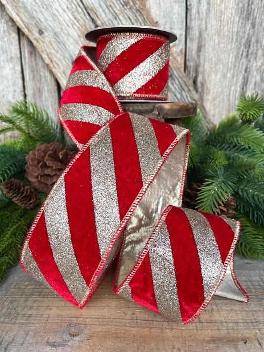 2.5" Red Gold Ribbon Diagonal Stripe, Christmas Tree Ribbon, Red Velvet Ribbon