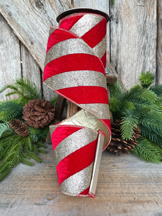 4" Red Gold Ribbon Diagonal Stripe, Christmas Tree Ribbon, Red Velvet Ribbon