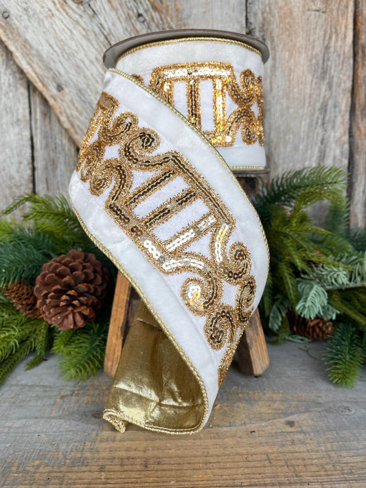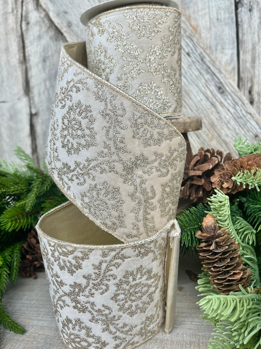 4" Ivory Gold Velvet Christmas Ribbon, 4" Ivory and Gold Filigree Wired Edge, Christmas Tree RIbbon