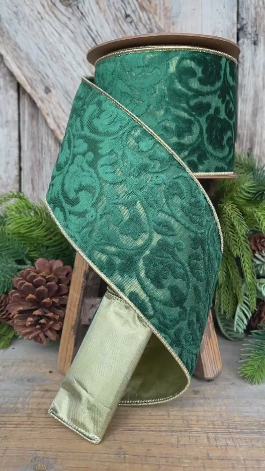 Emerald Green Embossed Velvet Christmas Ribbon: Wired Gold Backing, 4" x 10 Yards