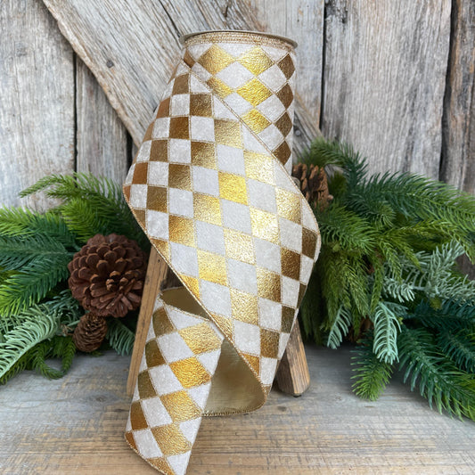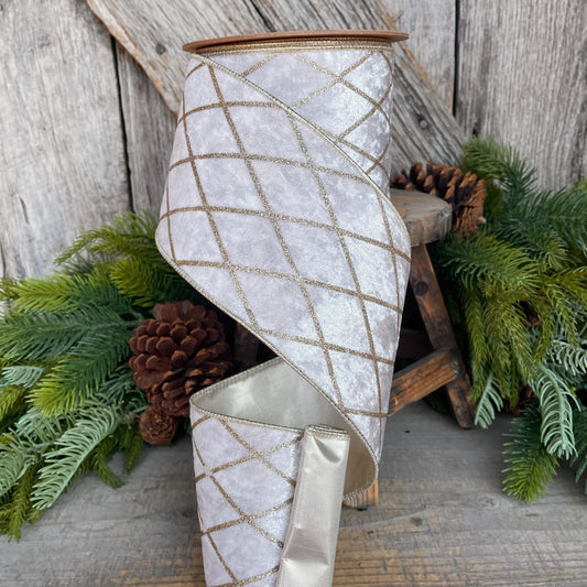Ivory Velvet Wired Ribbon, Ivory Gold Lattice Ribbon, Christmas Ribbon