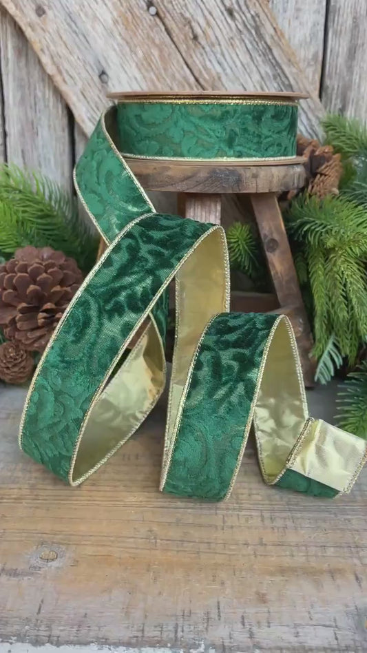 Emerald Green Embossed Velvet Christmas Ribbon: Wired Gold Backing, 1.5" x 10 Yards