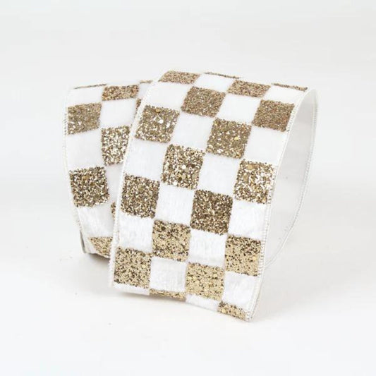 4" Ivory Gold Ribbon Glitter Check, Christmas Tree Ribbon, Ivory White Velvet Ribbon