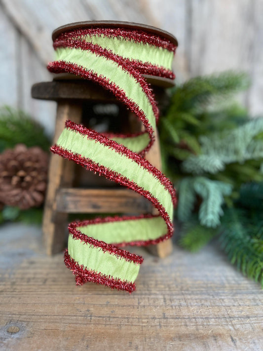 1" Lime Green & Red Tinsel Ribbon, Christmas Ribbon, Green Ribbon