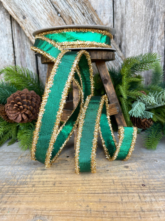 1" Emerald Green & Gold Tinsel Ribbon, Christmas Ribbon, Farrisilk ribbon