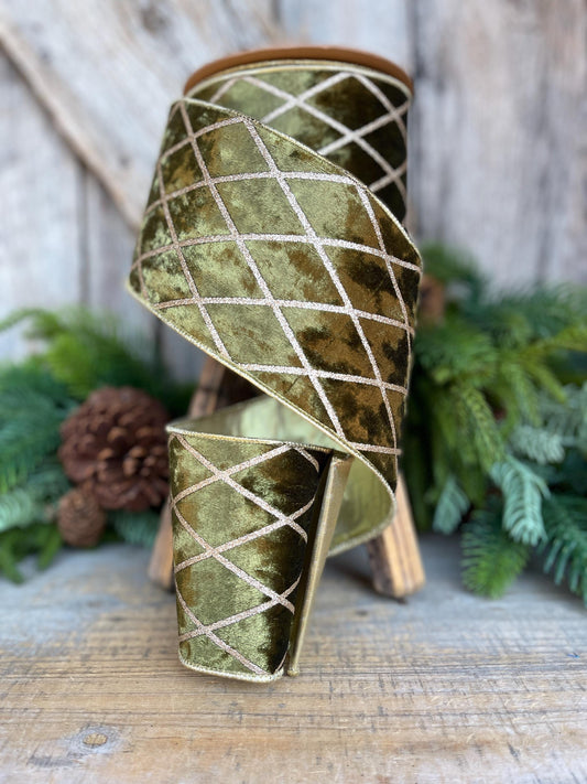 Dark Moss Green Velvet Wired Ribbon, Green Gold Lattice Ribbon Christmas Tree & Holiday Decor, 4" x 10yds