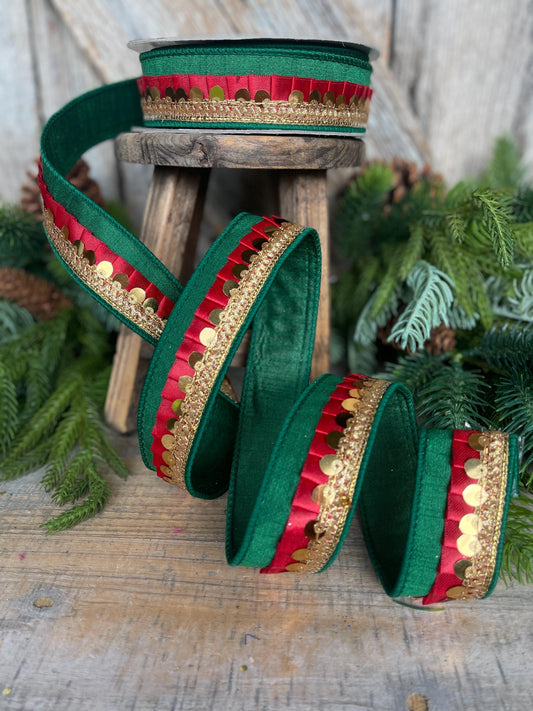 1" Green Red Festive Frills, Farrisilk RIbbon, Emerald Green Red Gold RIbbon