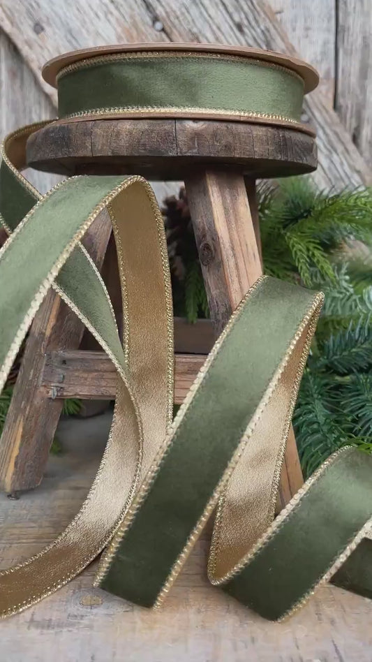 1" Forest Green Velvet Ribbon, Moss Green & Gold Velvet Ribbon, Christmas RIbbon
