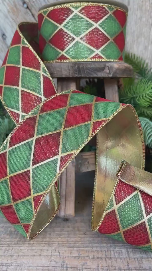 2.5" Red Green Antique Diamonds Ribbon, Farrisilk Ribbon, Harlequin Ribbon