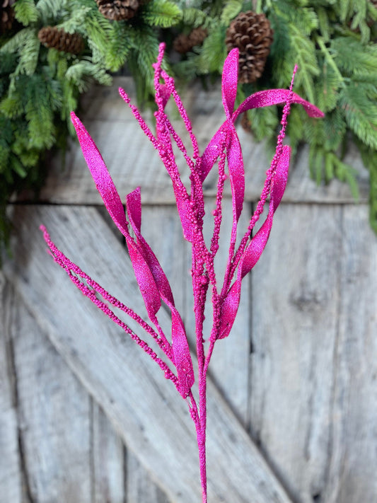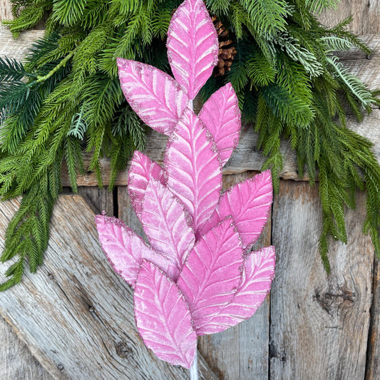 34" Hot Pink Glitter Leaf Christmas Spray, Christmas Leaves Spray, Christmas Floral Stem