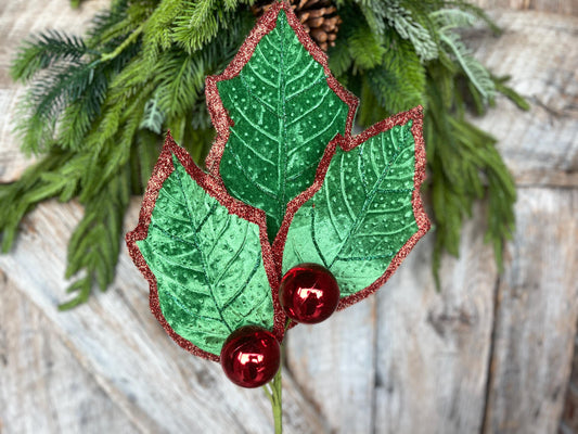 Red & Green Velvet Leaf Christmas Spray - 27" Tree Topper