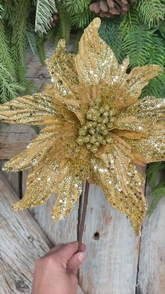 16" Gold Poinsettia Stem, Christmas Tree Stem, Gold Christmas Tree Flower