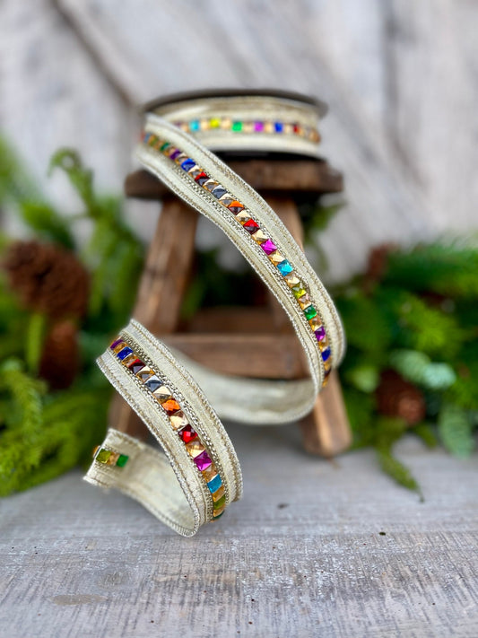 1" Platinum KALEIDOSCOPE Ribbon, Farrisilk Ribbon, Platinum Gold Jeweled Ribbon