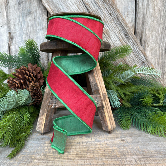 1.5" Red Green Dupion Ribbon, Christmas Ribbon, Double Sided Ribbon