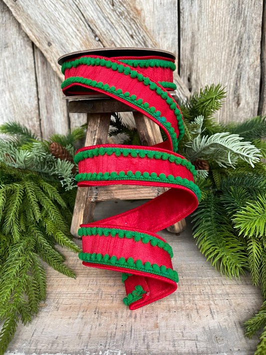 1.5" Christmas Ribbon, Wired Ribbon, Pom Pom Ribbon