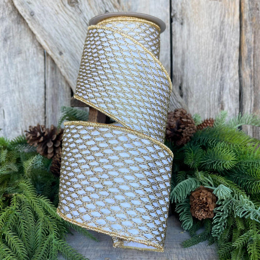 4" White Gold Ribbon, Farrisilk Ribbon, Gold lattice ribbon