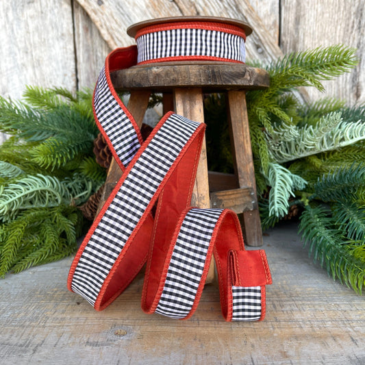 Rust Orange Check Ribbon: Black & White Mini Check, Wired Edge, 1" x 10yds