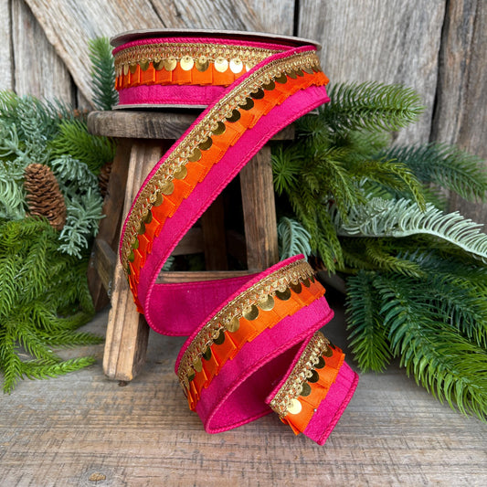 1" Pink Orange Festive Frills, Farrisilk RIbbon, Pink Orange Gold RIbbon
