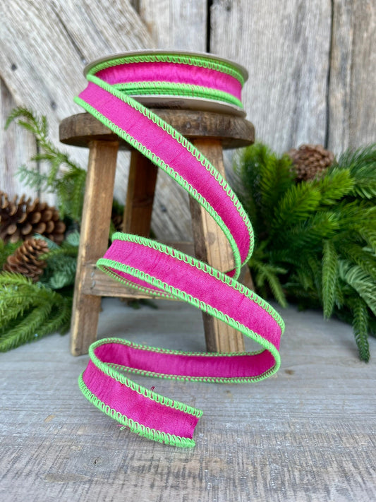 1" Hot Pink Lime Green Cord Ribbon, Hot Pink Ribbon, Narrow Ribbon