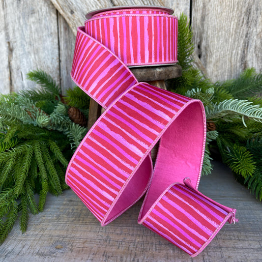 2.5" Red Pink Stripe Ribbon, Farrisilk Ribbon, Wired Ribbon