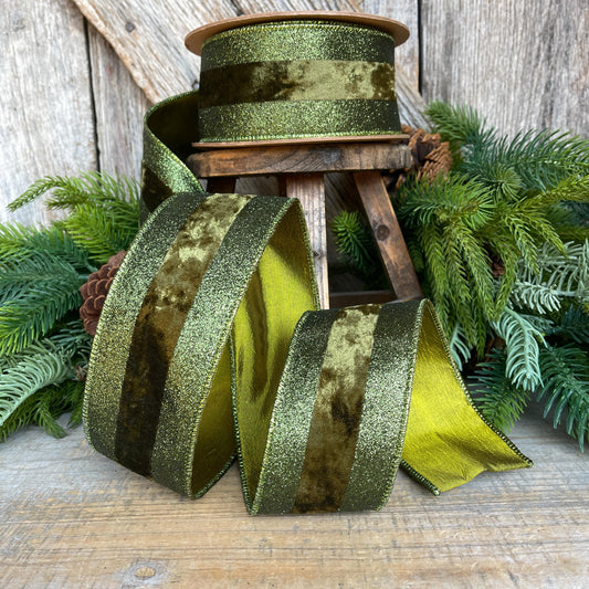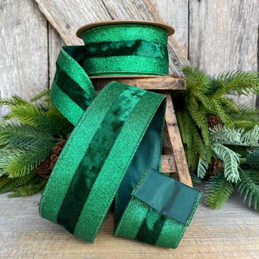2.5" Emerald Green Velvet Ribbon, Vlevet Glitter Stripe Ribbon, Christmas Ribbon