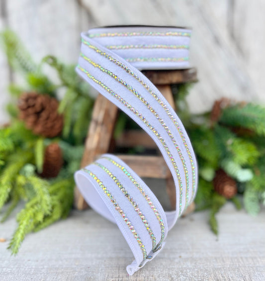 1.5" White Iridescent Jeweled Stripe Ribbon, Farrisilk Ribbon, Rhinestone Ribbon