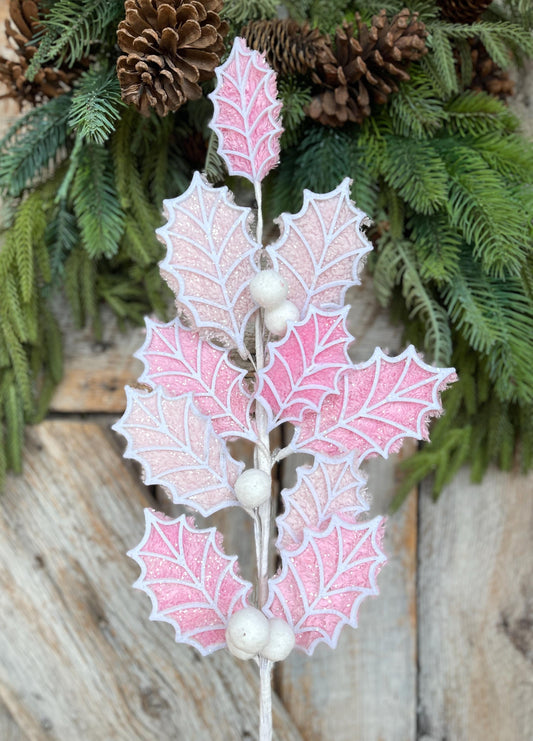 Pink & White Holly Leaf Christmas Spray - 31" Floral Stem