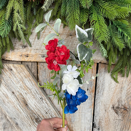 25" Patriotic Rose Spray, Artificial Floral Bush, Red White Blue Floral