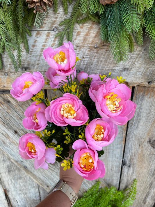 20" Pink Ranuculus Bush, Pink Yellow Floral Bush, Artificial Floral Bush